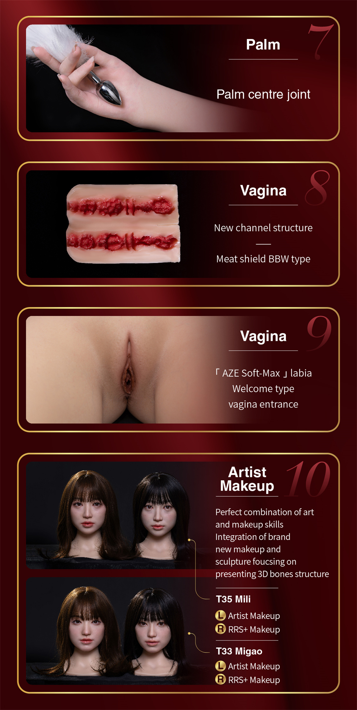 RRS+Makeup: The first "R" stands for surrealistic painting, the second "R" is for realistic skin texture, and "S" is for smooth matte effect. The "+" stands for further improvement of the realistic skin texture from the head molding and upgraded body details.