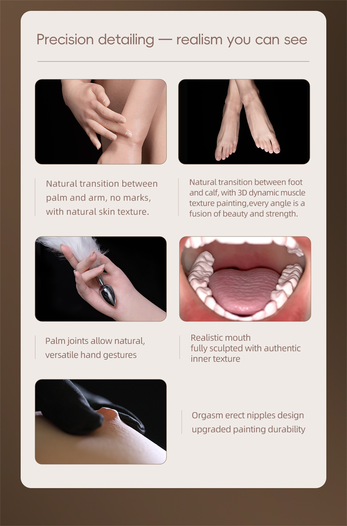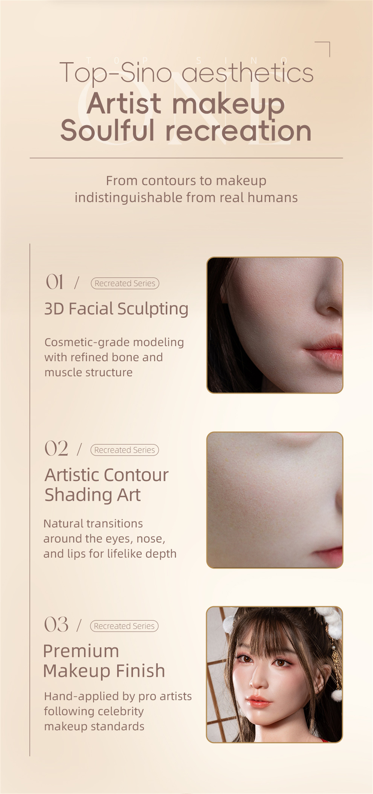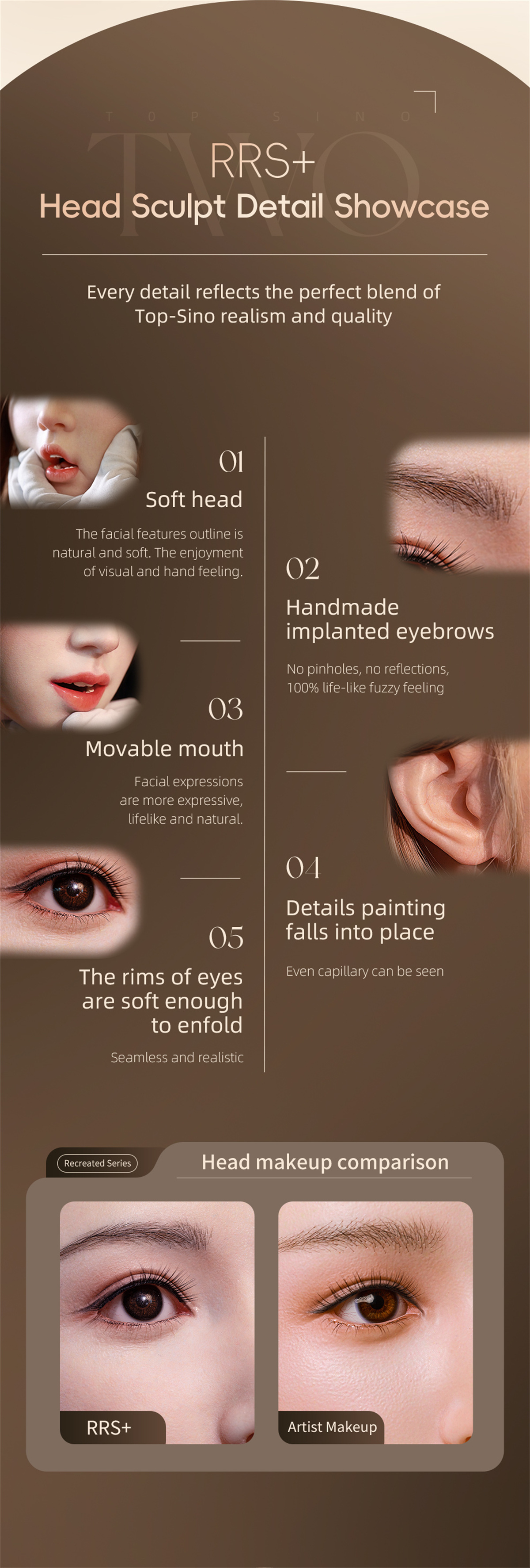 RRS+Makeup: The first "R" stands for surrealistic painting, the second "R" is for realistic skin texture, and "S" is for smooth matte effect. The "+" stands for further improvement of the realistic skin texture from the head molding and upgraded body details.