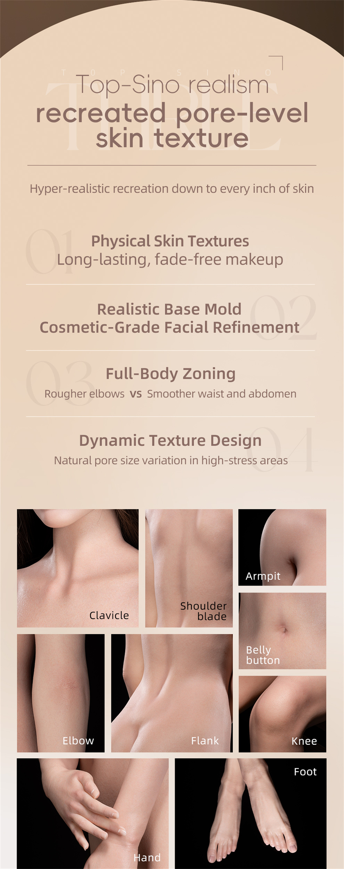 ①. The chest, abdomen, thighs, and buttocks have a soft finish.